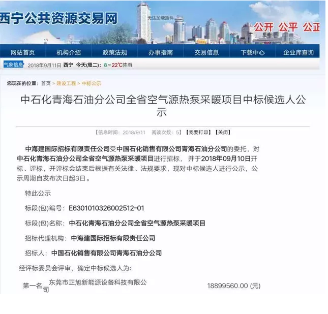 近日,中石化青海石油分公司全省空氣源熱泵采暖項目中標名單出爐,正旭空氣能成功中標。中國石化銷售有限公司青海石油分公司作為招標人委托中海建國際招標機構(gòu)進行了嚴謹招標工作,眾多熱泵企業(yè)同標競爭,正旭空氣能成為三家中標企業(yè)的第一名。