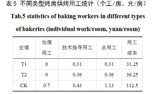 從表5可知,不同處理烘烤用工成本以對照CK最高,為112.5元/房;以處理T1最低,為31.25元/房;處理T2居中,為36.25元。分析比較用工構(gòu)成,可明顯看出,處理T1和T2與對照CK相比,技術(shù)指導(dǎo)用工相差不大;處理T1和T2比對照CK缺少了加煤用工環(huán)節(jié),而加煤用工在對照CK總用工量中占有較大比例,因此導(dǎo)致總用工量和成本明顯降低,其中用工成本比對照CK減少了76.25-81.25元/房。處理T2烘烤時間比處理T1長1天,所以用工成本相對較高。