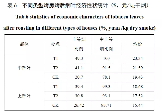 從表6可以看出,處理T1烤后煙葉的上等煙葉比例、中上等煙葉比例和均價最高,對照最低,處理T2除上部葉中上等煙比例比對照CK略低,其余指標(biāo)均高于對照CK,低于處理T1。其中處理T1中部葉分別比對照提高了28.6%、21.9%和3.91元/kg干煙,比處理T2提高了8.2%、8.5%和1.75元/kg干煙;上部葉葉分別比對照提高了12.98%、5.59%和3.24元/kg干煙,比處理T2提高了8.6%、6.2%和1.16元/kg干煙。