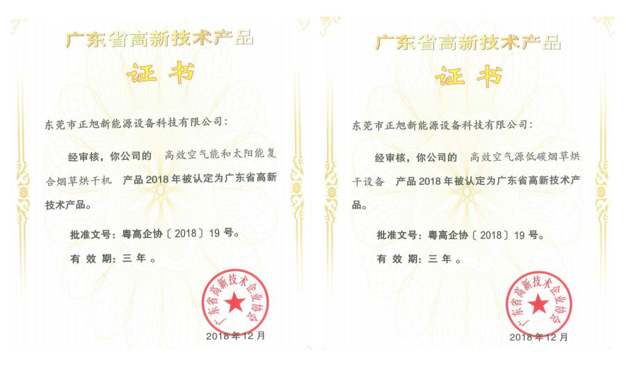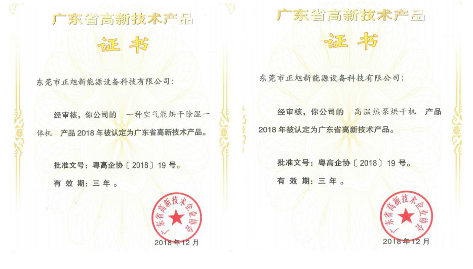 在過去的2018年,正旭熱泵烘干榮獲廣東省高新技術企業(yè)協(xié)會頒發(fā)的13項高新技術產品證書。正旭在熱泵烘干領域中的努力,得到了高新技術協(xié)會的充分肯定。13項高新技術產品證書包括空氣能烘干除濕一體機、熱泵冗余控制系統(tǒng)、高溫熱泵烘干機、多功能微型烘干機、分體式熱回收型熱泵烤房等等。