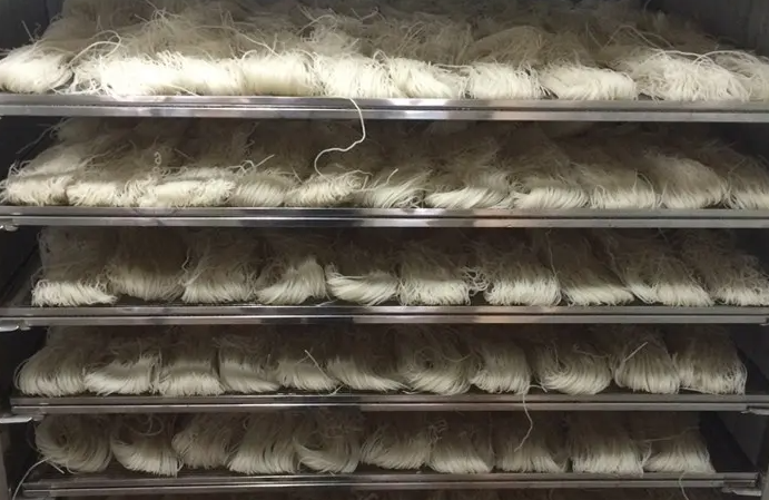 2、 將過(guò)夜冷凍后的紅薯粉條推入烘干房中,開(kāi)始進(jìn)行升溫排濕干燥;