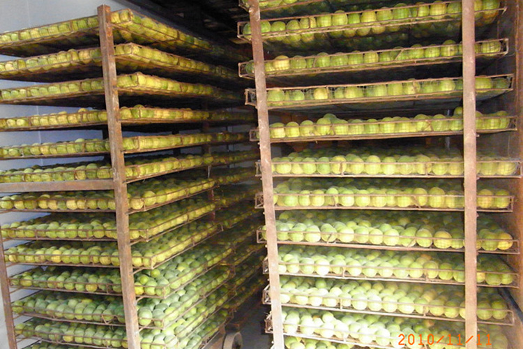 3、最后,降溫到55-60℃之間,繼續(xù)烘烤兩天,使果實的重量下降到相當鮮果的25-30%即成干果。待其自然降溫,待冷卻后出烘干房。