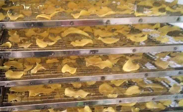 2.初始階段為定色階段,需要將烘干房溫度控制在40-45攝氏度之間,烘干兩小時,空氣濕度不宜太高,所以需要排濕,否則土豆片會出現(xiàn)表面氧化發(fā)黑的現(xiàn)象;