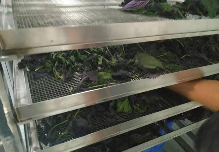 首先,紫蘇的單位體積大,重量輕,脫水率通常在80-85%,密集型堆放,會(huì)造成風(fēng)流穿透不過的情況,此時(shí)外部的紫蘇已經(jīng)完全干燥,可是內(nèi)部的紫蘇卻還是鮮的,所以紫蘇在烘干時(shí)不能采用堆積的方式,且在烘干的過程中要注意適時(shí)進(jìn)行翻動(dòng),讓熱風(fēng)更加均勻的穿透紫蘇葉。