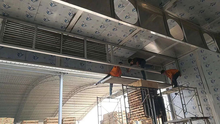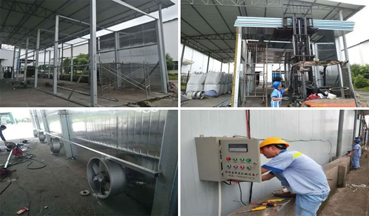 烘干房建造步驟大致可分類:安裝底板 →安裝立板→安裝頂板→安裝底板加強(qiáng)板(方便工人使用推車作業(yè)和烘房衛(wèi)生的打掃)→安裝主機(jī)→安裝循環(huán)風(fēng)機(jī)→安裝風(fēng)道板或勻風(fēng)板→連接電源線和排水管。